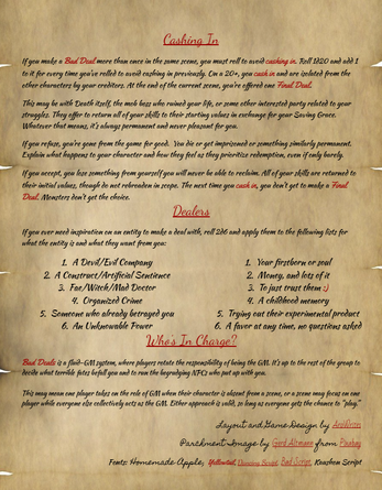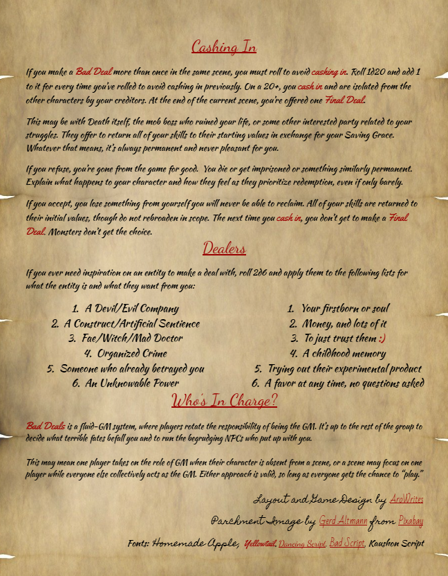 Bad Deals is a 2-page TTRPG about playing a terrible person making terrible decisions and facing terrible consequences. It's setting-agnostic and uses a d20 "roll under" system, meaning your cursed dice will actually help you out!