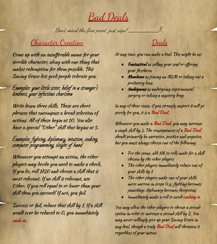 You have an array of skills that lower each time you use them. The only way to increase your skills are to make Bad Deals. Agreements and promises you know are gonna come back to haunt you. And there's no GM. Your fellow players are the ones deciding what terrible fate befalls you!